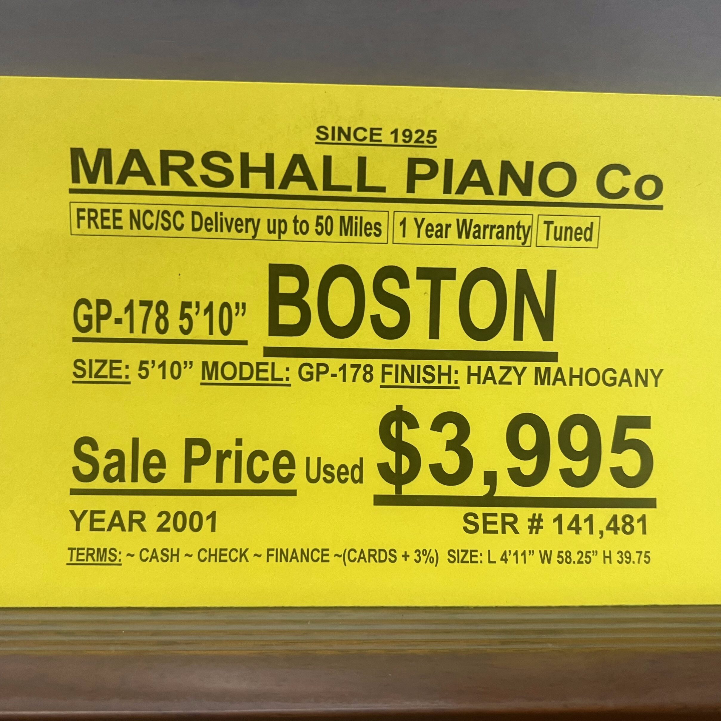 A 2001 Boston GP-178 grand piano that is 5’10” in length & has a hazy mahogany finish. The finish is the only flaw, structurally the piano is still very nice & in good condition.
